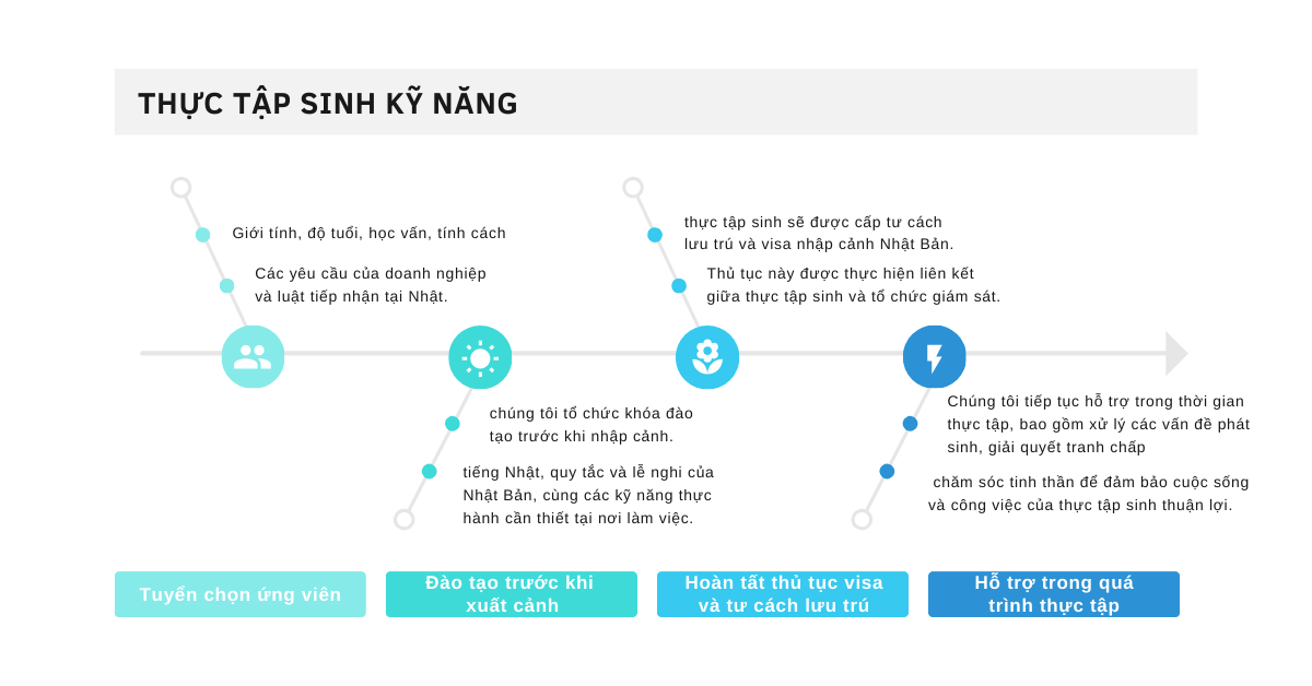 Thực tập sinh kỹ năng là chương trình đưa người lao động ra nước ngoài theo hình thức vừa học – vừa làm, nhằm giúp người tham gia tiếp cận kỹ thuật tiên tiến, nâng cao tay nghề và tích lũy kinh nghiệm làm việc thực tế trong môi trường quốc tế.